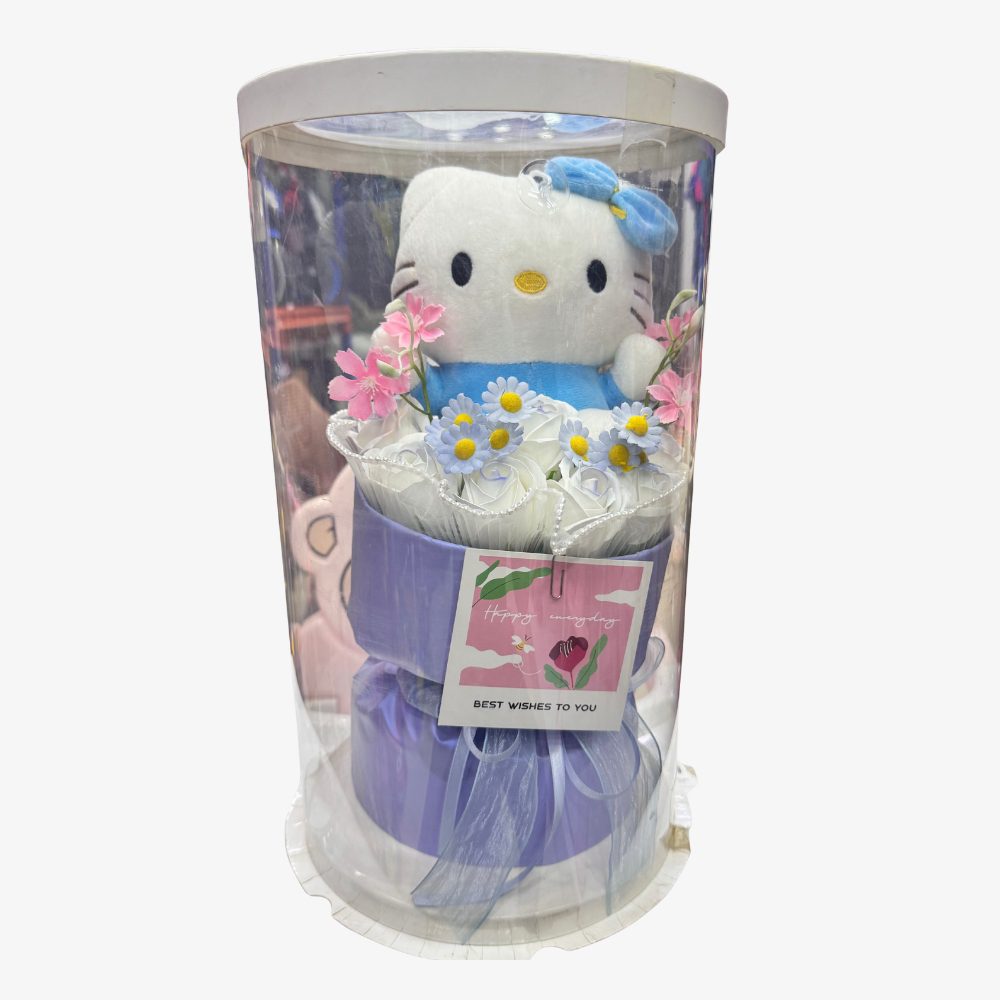 A cute Hello Kitty Flower Bouquet featuring a soft plush toy arranged with pastel flowers in a premium gift box. Perfect for birthdays, anniversaries and special occasions.