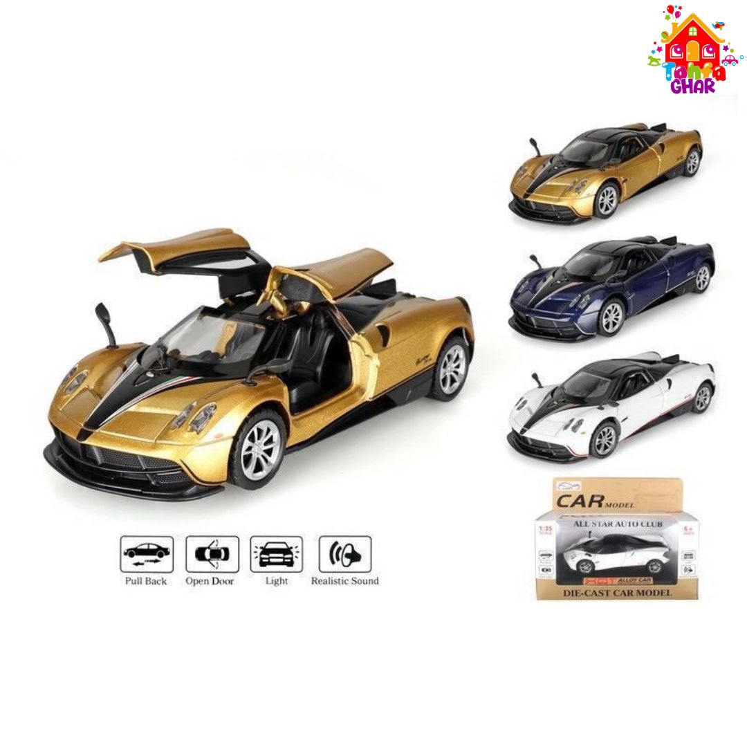 Unleash speed and style with this stunning Pagani All-Star Auto Club Die-Cast Car Model. This 1:32 scale replica captures the sleek, aerodynamic design of the legendary supercar. The model is highly detailed, featuring iconic gull-wing doors that open upwards, working lights, and realistic sound effects for an authentic experience. Its pull-back function allows it to zip across the floor, providing thrilling fun for kids and a beautiful display piece for collectors. Available in striking colors like gold, blue, and white, this model is a true standout.