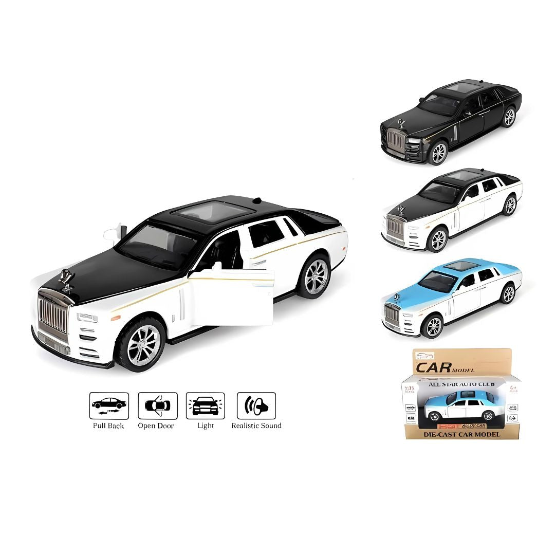 Experience luxury in miniature with this exquisite Rolls-Royce All-Star Club Die-Cast Car Model. This 1:32 scale replica is a must-have for car enthusiasts and collectors. Featuring a realistic design, the model boasts functional doors that open, working lights, and realistic sound effects for a truly immersive play experience. The pull-back action allows it to race forward, making it a perfect blend of display quality and fun. Available in classic colors like black, white, and a distinctive two-tone finish, this toy car offers a high-end feel for all ages.